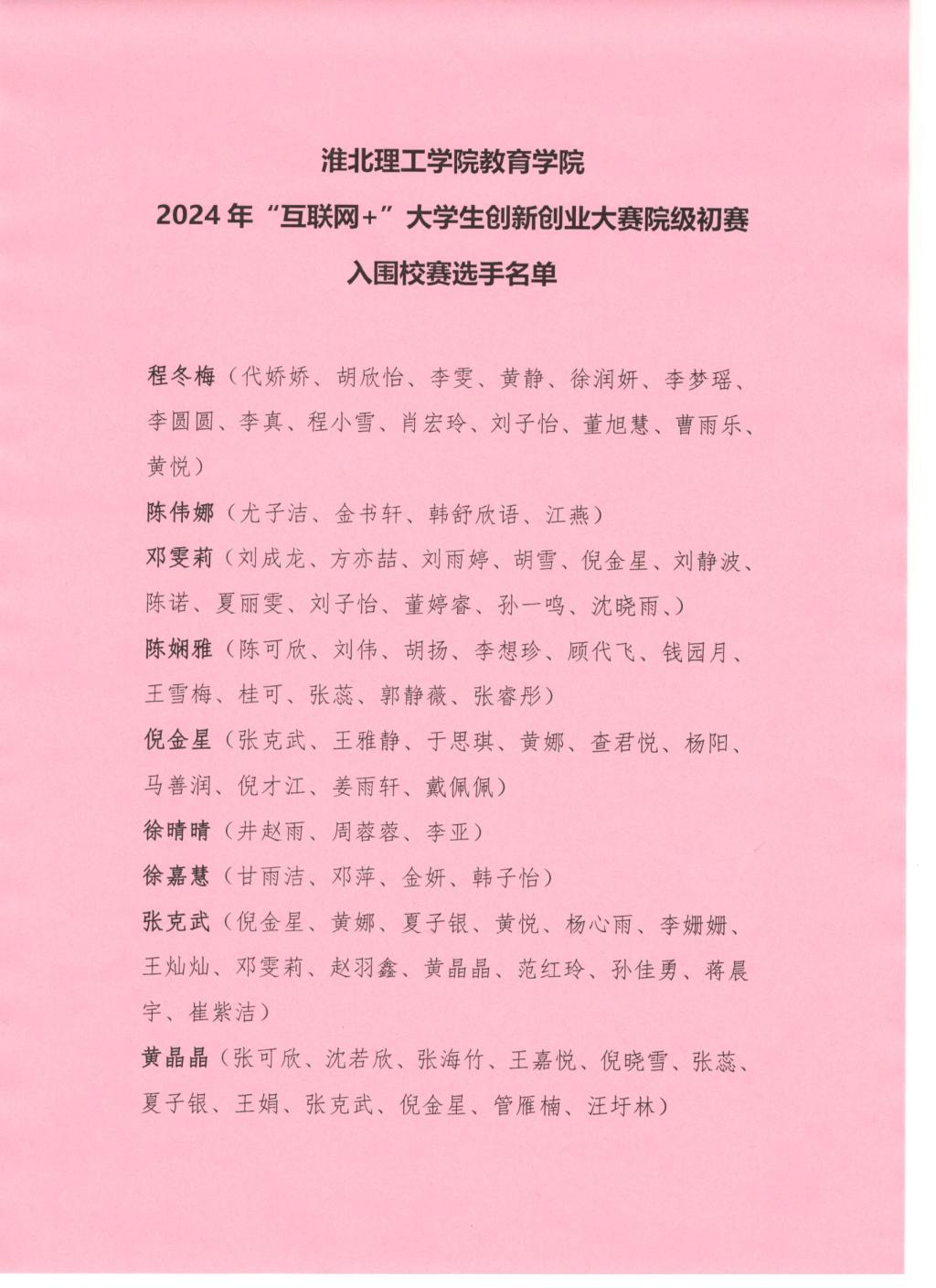 澳门正规电子游戏平台2024年“互联网+”大学生创新创业大赛院级初赛入围校赛选手名单