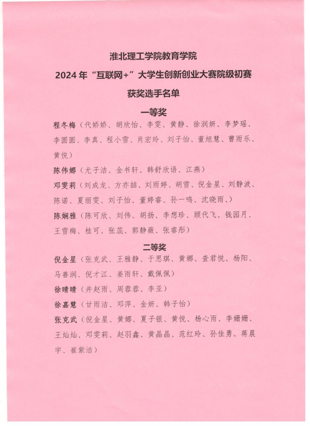 澳门正规电子游戏平台2024年“互联网+”大学生创新创业大赛院级初赛获奖选手名单