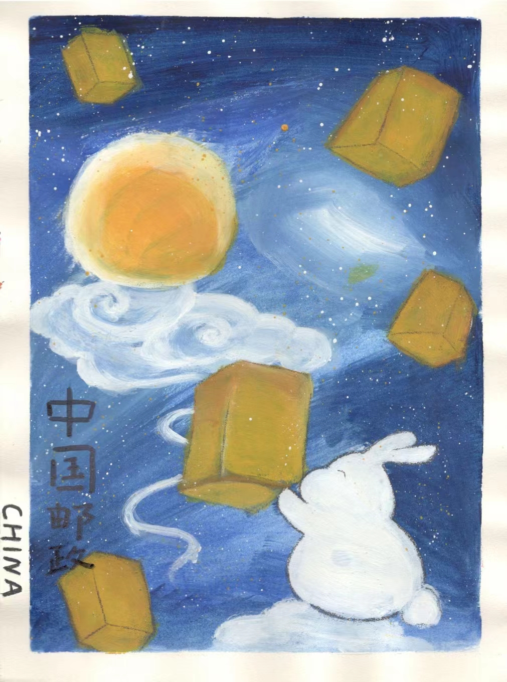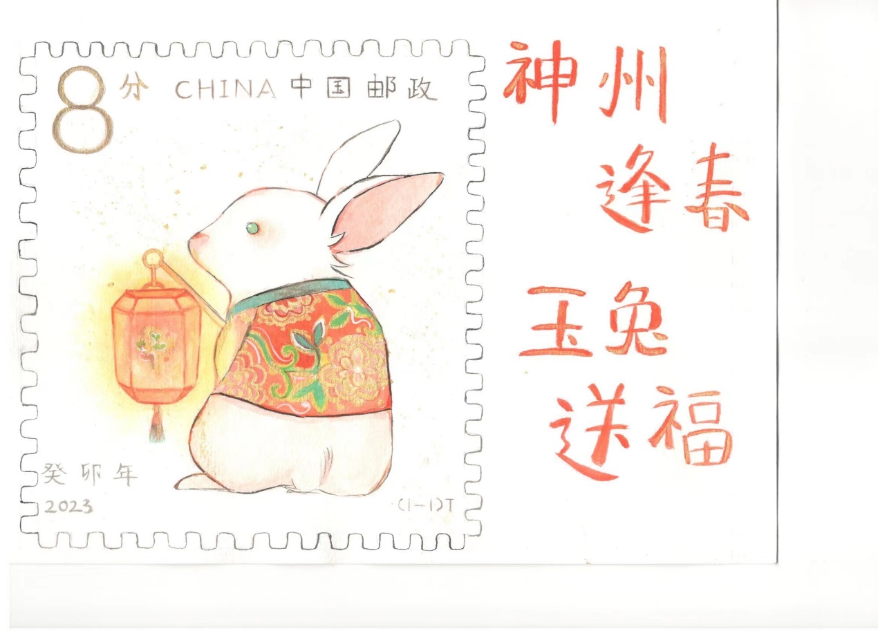 介绍:为了迎接是癸卯年,我设计了该邮票。邮票名为《双兔送福图》。一只是红色剪纸兔子,在月光下轻嗅桂香,有意展现中国传统神话中的玉兔和桂树。一只是玉兔号,中国首辆月球车,富有时代气息。迎春当然少不了福,于是运用中国剪纸制作了祥云福字,再加上齿孔,面值,铭记,就构成了这张邮票。