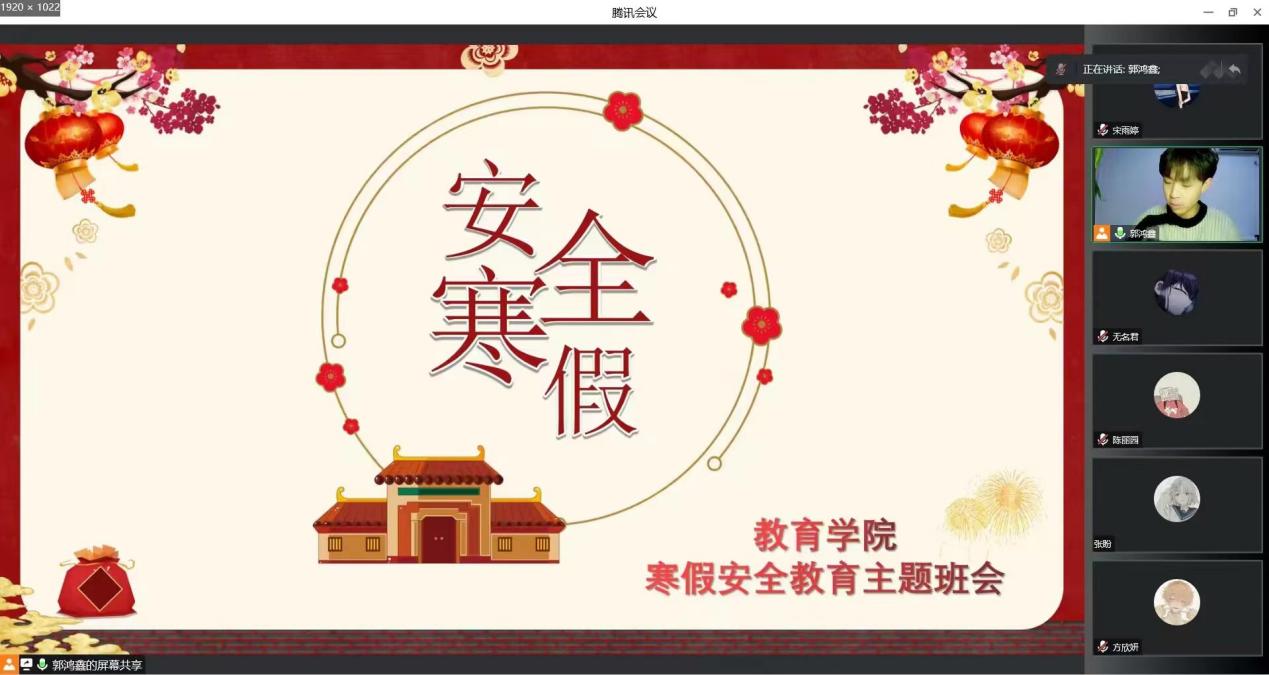 为进一步做好学生假期安全教育工作,落实安全教育的常态化,保障假期安全工作不松懈,确保同学们度过一个平安、快乐、有意义的寒假,2023年1月14日,澳门正规电子游戏平台全体辅导员组织各班同学开展了线上寒假安全教育主题班会活动。