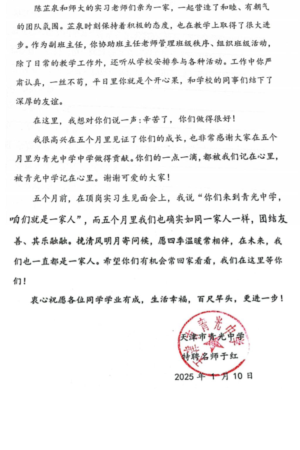 在实习学校的精心培养和个人的刻苦努力下,实习生收获了优异的成果。从学生们的学习成绩来看,他们所带班级的成绩有了明显提升,在学校组织的阶段性测试中,进步显著。更令人欣喜的是,学生们的学习态度发生了积极转变,对学习的热情和主动性大幅提高。实习生们还参加学校举办的各类青年教师竞赛和文体活动,他们表现得格外出色,充分展现了综合素质的提升。