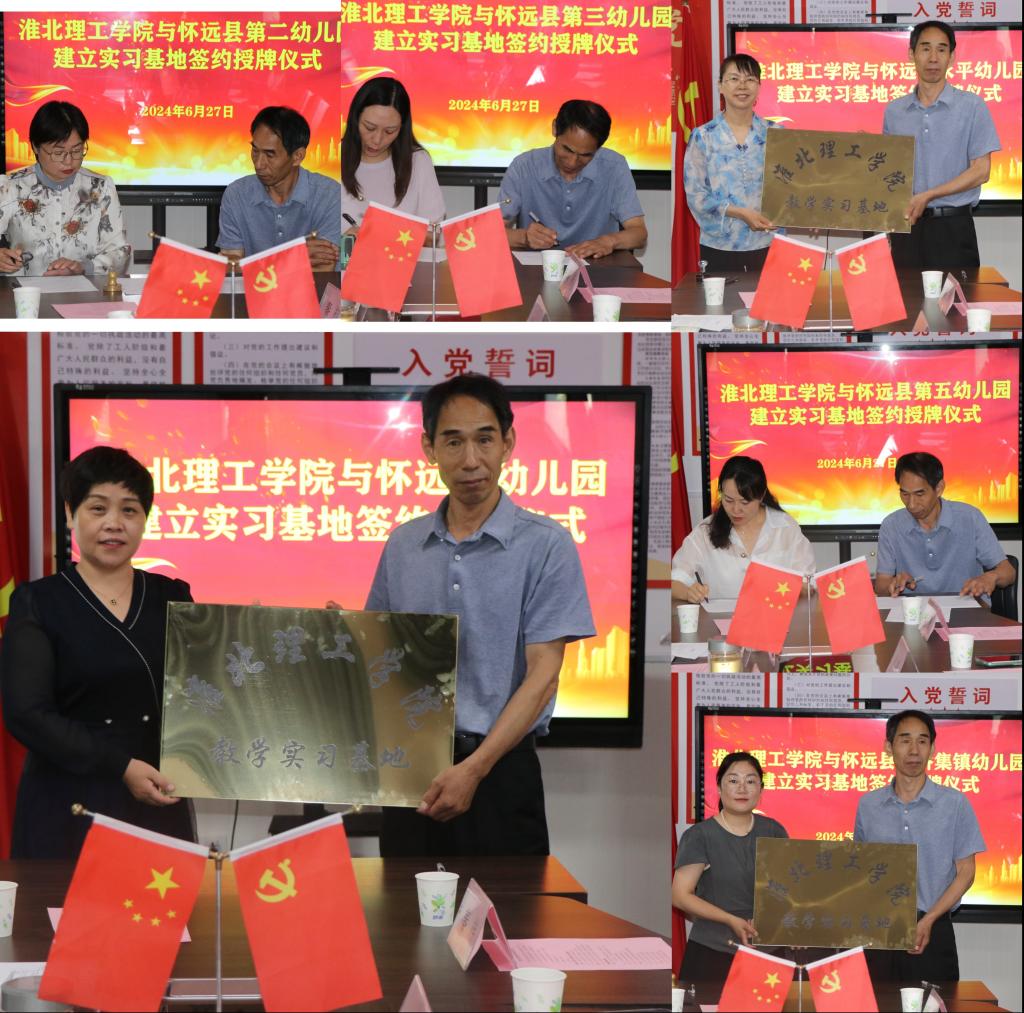 在实践基地的六所幼儿园园长分别对各自园所进行了详细介绍后,怀远县县幼园长刘利代表宣读实践基地签约协议书,双方就协议书的内容进行了充分的交流和沟通。而后在友好而庄重的气氛中,澳门正规电子游戏平台副院长谢贤德与六所园所园长分别签订协议书,并举行了授牌仪式,这标志着双方合作迈出了坚实的一步。