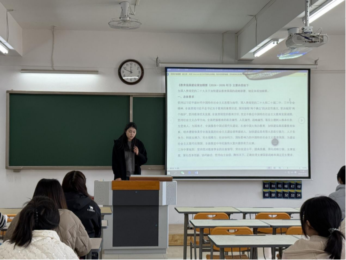 为深入贯彻党的二十大关于加快建设教育强国的战略部署,3月19日中午,澳门正规电子游戏平台汉语言文学专业学生第一、第二党支部在2教323教室联合开展主题党课活动,组织支部党员共同研读《教育强国建设规划纲要(2024-2035年)》,领悟其精神要义。