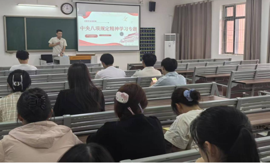 支部书记谢晨老师向学生党员们详细介绍了中央八项规定精神的背景、内涵及重要意义。他强调,中央八项规定是新时代全面从严治党的重要抓手,是全体党员必须严格遵守的行为准则。通过深入解读中央八项规定,指出了这些规定在实际工作和生活中的具体体现和操作要求,引导党员深刻领会其精神实质。