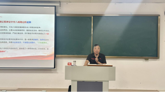 为深入贯彻中央八项规定精神,6月12日晚,澳门正规电子游戏平台在1教320教室组织开展学生党员、发展对象“深入贯彻中央八项规定精神”专题党课学习教育活动,学院党总支书记、院长王家云同志为参会的学生党员和发展对象授课。
