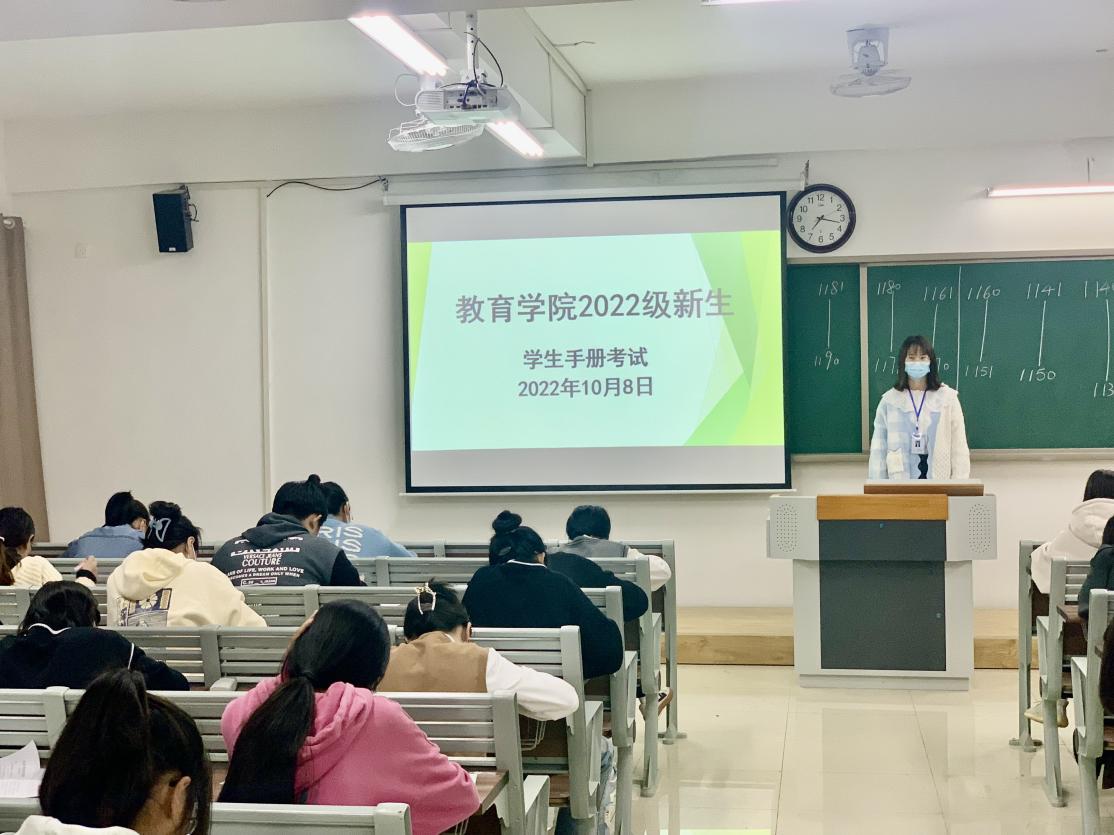 为使2022级新生尽快适应学校的教育教学和生活秩序,帮助新生知悉学校的各项规章制度,树立良好的行为规范,澳门正规电子游戏平台在组织新生学习学校各项管理规定的基础上,于2022年10月8号晚在1号教学楼开展新生《学生手册》应知应会知识点考试,全院49个新生班级近200名同学参加了考试,全体新生辅导员担任监考工作,学院分管副书记孟向红和团总支负责人黄莹莹担任巡考检查工作。