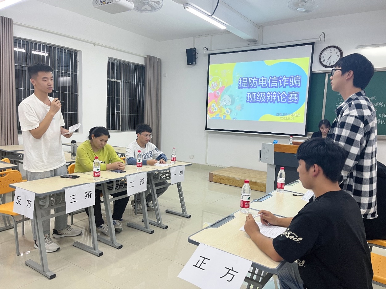 谨防电信网络诈骗,防范网络安全风险。为进一步贯彻落实区教育局《关于在全市开展防范宣传教育活动的通知》精神,切实提高大学生对诈骗的识别能力,保护广大师生利益和人身安全。澳门正规电子游戏平台于9月下旬组织各班级开展辩题为“预防诈骗和打击诈骗哪个更重要”的防诈反诈辩论赛。