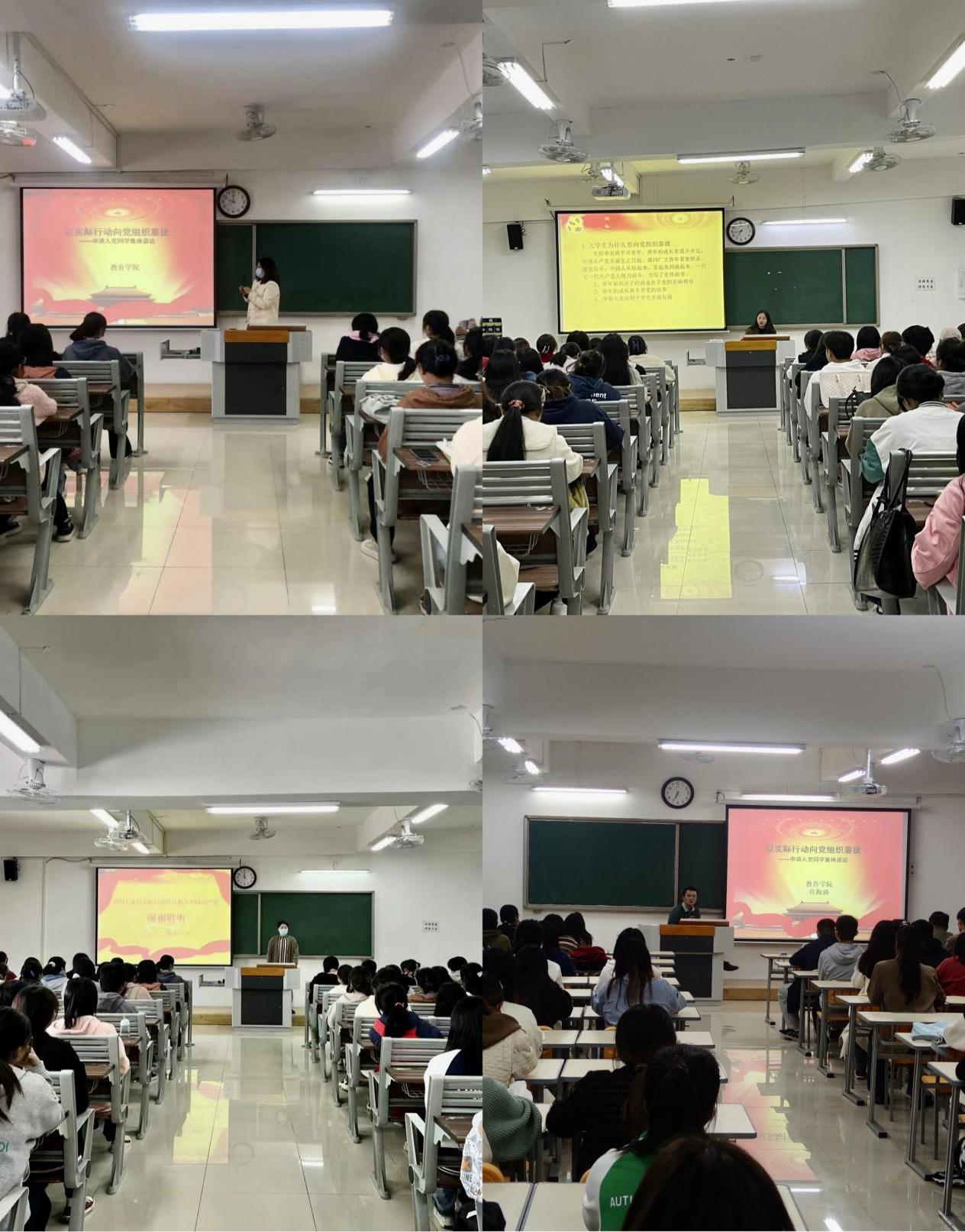 会议上,辅导员充分肯定了同学们积极向党组织靠拢的美好愿望。指出:青年学生的前途在于党的正确领导,青年学生的成长离不开党的培养,争取入党有利于青年学生全面发展。集体谈话会上老师们通过PPT向同学们介绍党的基本知识、基本理论以及大学生党员的质量标准、加入党组织的必要途径和流程等,并就“大学生怎样争取实现入党愿望”提出了明确的建议。