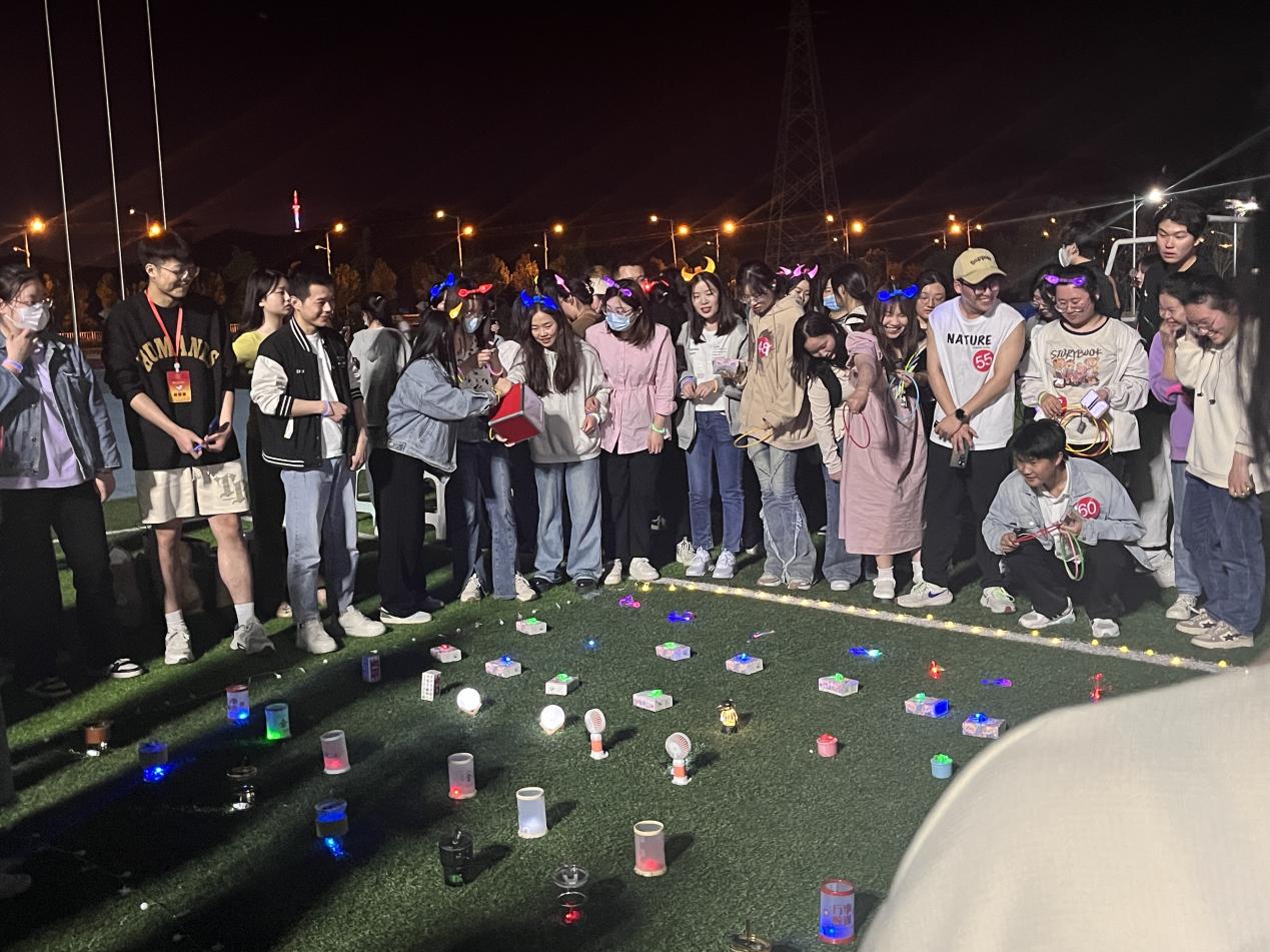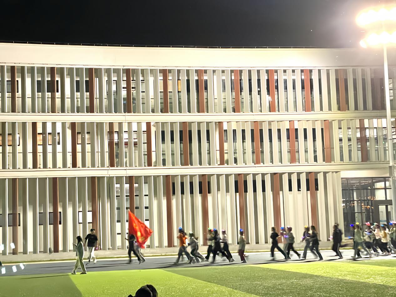 参加活动的同学、老师云集在操场主席台前,在工作人员的引导下,有序排队、签到,并领取号码牌、荧光棒等荧光物资,工作人员讲解了活动规则及注意事项,孙虎老师做了简短的动员讲话。大家在领队带领下做了热身运动后,按照规则打开运动软件Keep按照指定路线等待夜跑开始。光影跳动,荧火相随。参加活动的同学迫不及待地拿起荧光棒,戴好荧光手环,等待着比赛的开始。随着一声号令,队员们一起化身为光,点亮学校的操场。