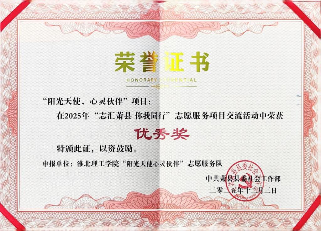 近日,由萧县县委社会工作部主办的2025年“志汇萧县·你我同行”志愿服务项目交流活动圆满落幕。在刘畅老师的悉心指导下,澳门正规电子游戏平台“阳光天使,心灵伙伴”志愿服务团队凭借专业的服务理念、扎实的实践成效脱颖而出,荣获活动优秀奖,为萧县志愿服务事业增添了温暖底色。