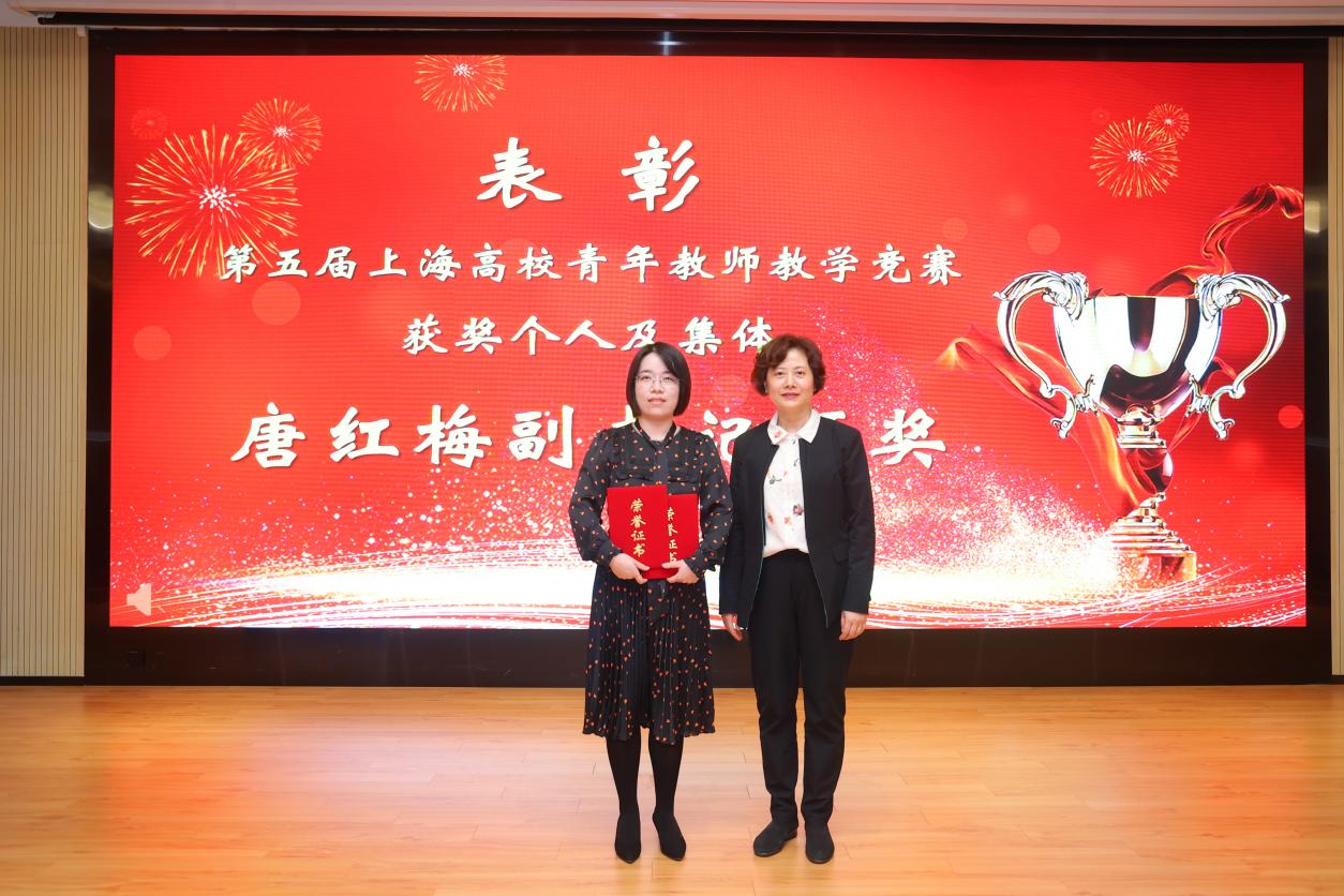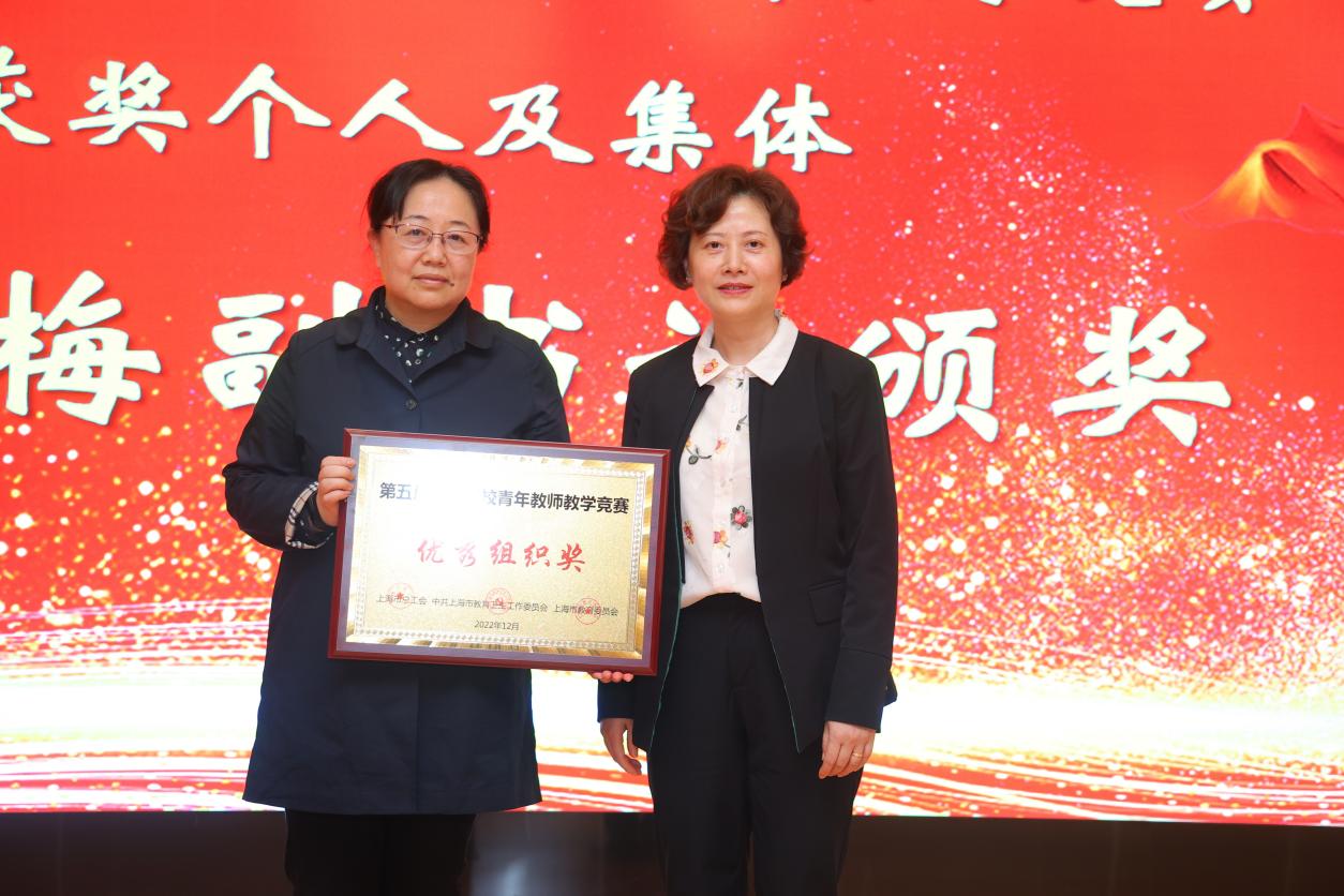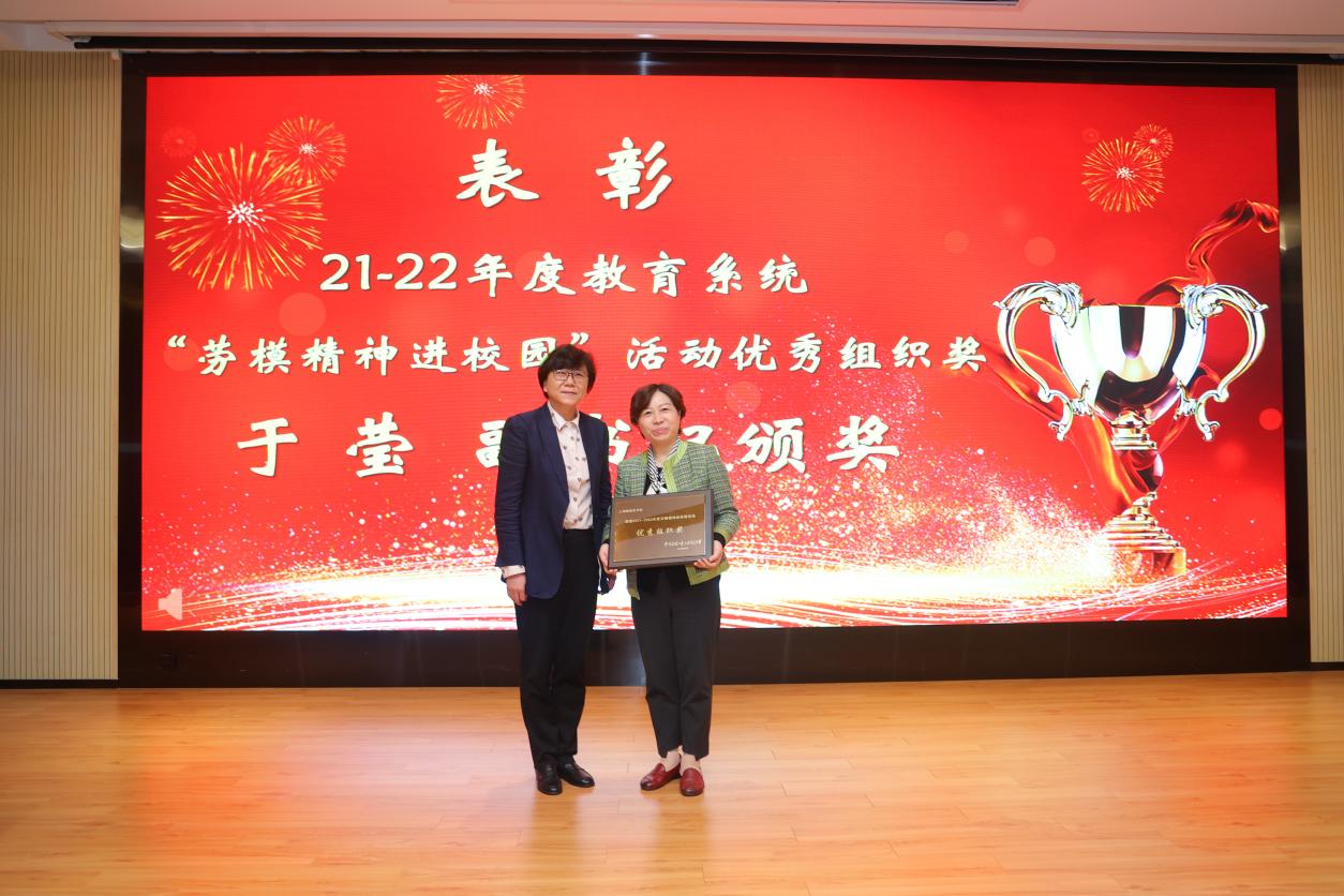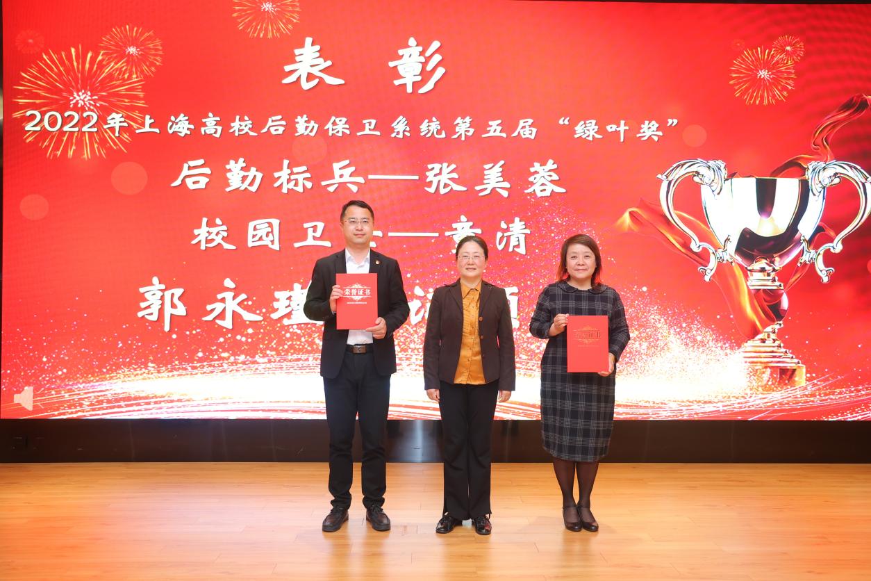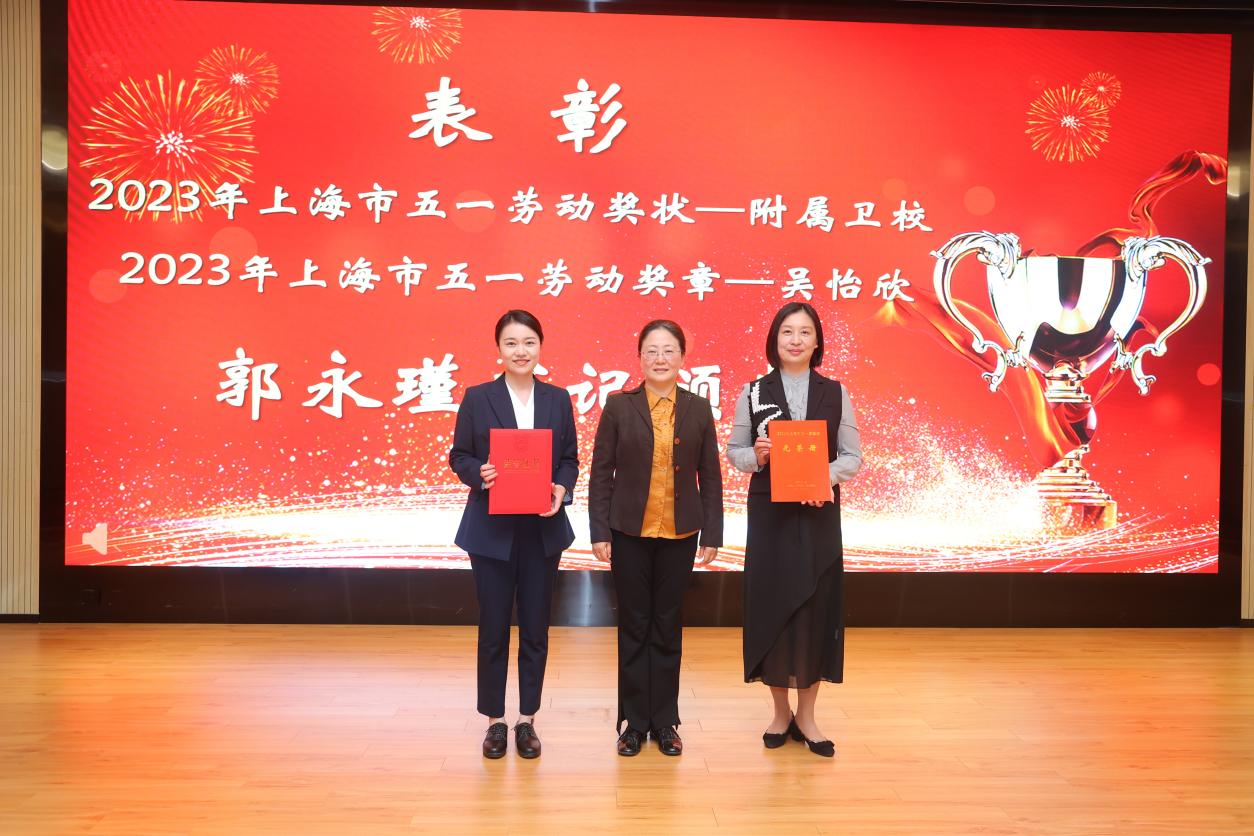 随后进行了表彰和授牌仪式。郭永瑾为 2023年上海市五一劳动奖状获得者附属卫校、2023年上海市五一劳动奖章获得者吴怡欣、2022年上海高校后勤保卫系统第五届“绿叶奖”上海学校后勤标兵张美蓉、上海高校校园卫士童清颁奖。唐红梅为2022年第五届上海高校青教赛一等奖、二等奖、三等奖、优胜奖、优秀组织奖颁奖。于莹为2021-2022年度教育系统“劳模精神进校园”活动优秀组织奖、2022年度上海市教育系统最佳教代会提案颁奖。