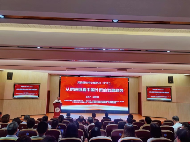 10月18日,beat365官方网站党委理论学习中心组举行“加快构建新发展格局,着力推动高质量发展”专题扩大学习会,原国家质检总局技术委员会主任、海关总署上海特派办副主任、一级巡视员,现海关总署纺织技术规范委主任、中国海关管理干部学院客座教授、海关学院教授谢秋慧应邀作“从供应链看中国外贸的发展趋势”专题辅导报告。全体在校校领导、全体中层干部、马克思主义学院部分教师、专职辅导员参加学习。学习会由校党委书记郭永瑾主持。