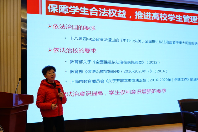 学校法律顾问王云丽律师作为主讲嘉宾,以“保障学生合法权益,推进高校学生管理法制化”为主题,结合其高校法律事务实践经验,从学校与学生的法律关系、高校学生事务法治化背景、学生管理中的法律思维方式、高校学生事务法治化基本问题等方面进行了分享。通过丰富的实际案例,对《普通高等学校学生管理规定》、高校学生管理中的可诉行政行为、学生权益保护等高校学生管理规定和实务进行解析,从理论到实践,深入浅出地分析了当前学生教育法治化管理面临的困境与挑战,普及了高等学校学生管理相关的法律知识。