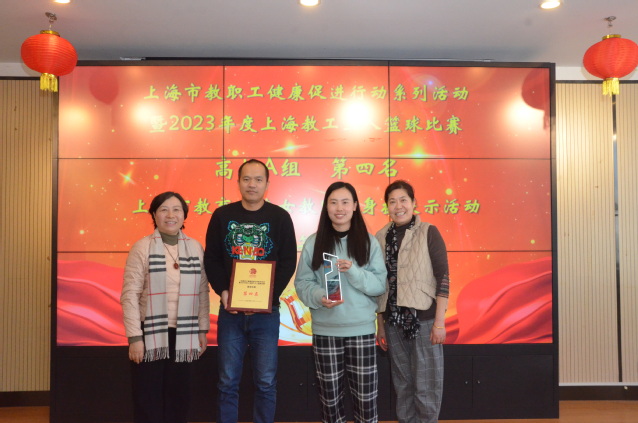 芦静宣读2023年下半年教职工参加上海市教育工会(妇工委)及学校各类活动的获奖集体:beat365官方网站第九届运动会教工团体前八名、2023年上海教工三人篮球第四名、2023年女教师健身操比赛第二名。凌文惠、芦静、郁建新为获奖的集体颁奖。