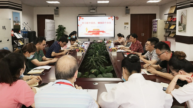 教务继教联合直属党支部委员杨琛领学《学习新中国史,增强“四个自信”》。她首先介绍了继教党小组关于新中国史学习任务安排,随后从“沧桑巨变”、“光辉历程”、“求索之路”、“历史机遇”四个方面详细介绍了新中国成立以来,在中国共产党的领导下,我们筚路蓝缕、辟除榛莽、走向辉煌、走向复兴的史诗般历史进程。讲解以时间发展为脉络,结合“两弹一星”、“载人航天”、“港澳回归”、“加入世贸”、“北京奥运”等10个经典案例展示了中国创造的伟大奇迹,并以公立医院的“建立期”、“成熟期”、“调整期”、“发展期”、“改革期”为切入点,探索医疗改革发展之路,真正做到以史鉴今,知史育医。领学结束,支部延续第一次专题学习采用的问答形式,根据学习内容设置了三道挑战题,由纪检委员张浩同志随机抽取党员进行有奖答题,该形式内容新颖,既检验了党员学习的成效,同时保障了专题学习真正做到入脑入心。