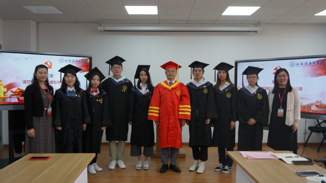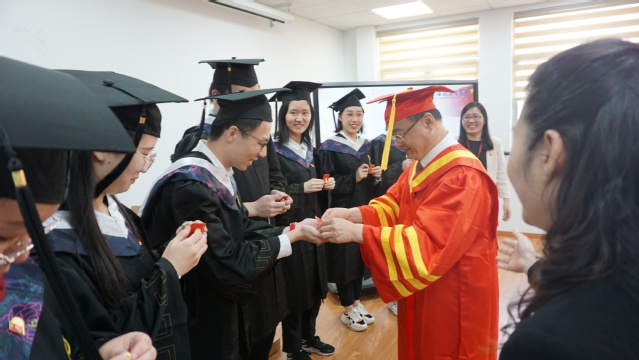 活动中,校院领导为全体毕业生党员颁发毕业生纪念章,为毕业生送上临行嘱托,期望毕业生党员以更加优异的成绩为党旗增辉,为母校添彩。毕业生纪念章不仅仅是一块勋章,更多的是寄托着母校的关怀,镌刻着母校的期许,彰显着毕业生党员的荣誉和责任。校长荣誉学位获得者沈钰涛、邱跃珏两位同学为母校送上祝福和感谢,送上我院毕业生写有校训“厚德至善 健行康民”和“感恩”的扇子,以及画有黄校长Q版头像的工艺品,寄托了对母校和黄校长的感恩之情。