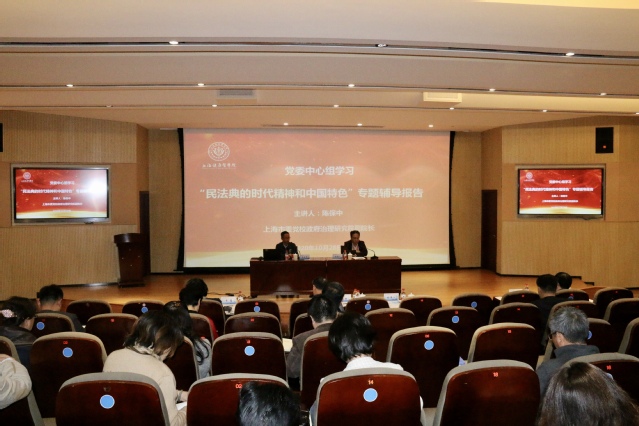 10月28日下午,beat365在北苑1号楼200人报告厅召开党委理论学习中心组集中学习,专题学习《民法典》。上海市委宣讲团成员,上海市委党校政府治理研究院副院长、公共管理教研部教授陈保中应邀主讲,作了题为“民法典的时代精神和中国特色”专题辅导。全体党委中心组成员聆听了报告,市教卫工作党委二级巡视员杨伟人主持会议并讲话。
