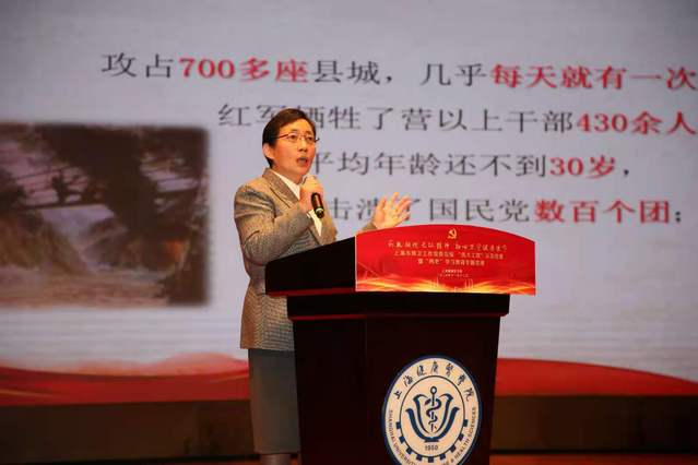 由校原党委书记郑沈芳教授开讲,她以《长征“三问”与自我叩问》为主题,深刻阐述了新时代为什么要继续弘扬长征精神,回顾习近平总书记提出的长征“三问”:“长征中能活下来的有多少人?红军战士靠的是什么?图的是什么呢?”,通过案例和数据再现红军长征的艰难险阻,展现当年红军不畏远征难的壮志情怀。郑沈芳教授指出,总书记的三问,是奋斗之问、信念之问和初心之问,叩问共产党员的初心使命。她强调,党的十九届五中全会已为国民经济和社会发展谱写 “十四五”规划和2035年的远景目标,需要我们为之奋斗,高扬长征精神,回答好“三问”,担当起建设中国特色社会主义现代化国家的重任,奋力走好新时代的长征路。