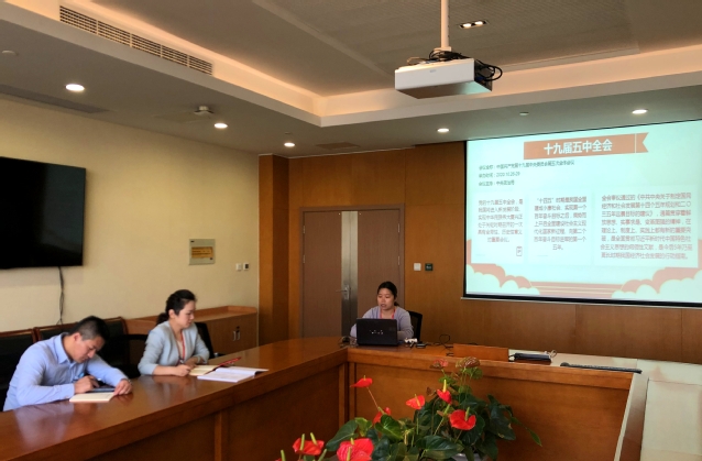 会上,党支部书记王梦星进行导学,她首先带领大家回顾了十九届五中全会,并指出:党的十九届五中全会,是我国将进入新发展阶段、实现中华民族伟大复兴正处于关键时期召开的一次具有全局性、历史性意义的重要会议。“十四五”时期是我国全面建成小康社会、实现第一个百年奋斗目标之后,乘势而上开启全面建设社会主义现代化国家新征程、向第二个百年奋斗目标进军的第一个五年,具有极为重要的意义。