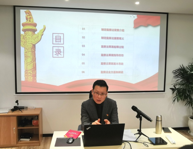参观结束后,大家来到廉政文化馆会议室,黄鹏副院长带领大家领学了《中华人民共和国监察法》,他围绕监察法背景介绍、指导思想和全文三个方面进行导读。制定监察法是贯彻落实党中央关于深化国家监察体制改革决策部署的重大举措,对于创新和完善国家监察制度,实现立法与改革相衔接,以法治思维和法治方式开展反腐败工作,意义重大、影响深远。对推进国家治理体系和治理能力现代化具有深远意义。